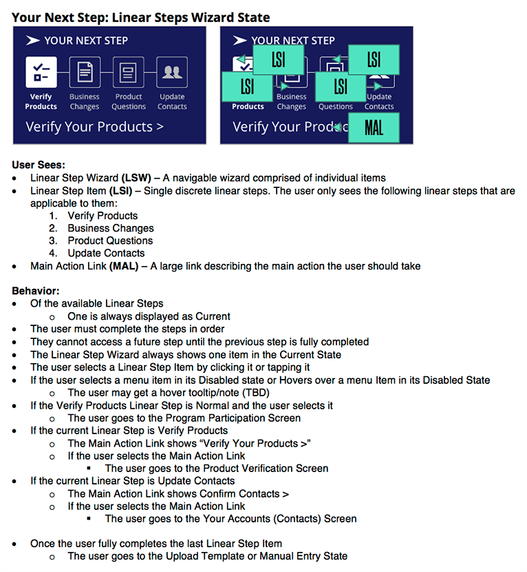 Creating behavioral guidelines involves outlining how a user interacts with the system, describing everything the user can see and interact with on-screen. These specs helped the design team, engineering team and stakeholders all get on the same page about how the software must behave.