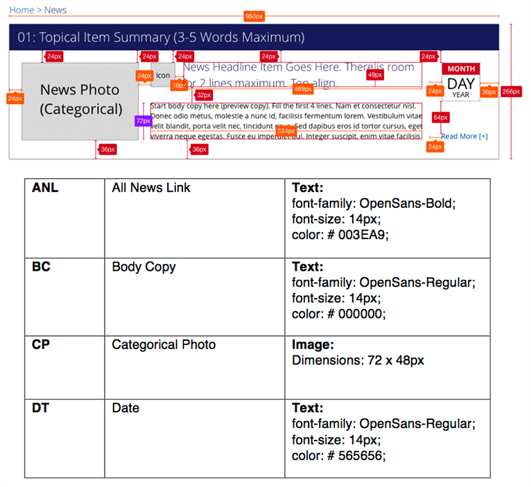 Because the team was new to an agile methodology and the business stakeholders were unfamiliar with software development, I provided additional guidelines that went beyond traditional redlines. Providing production-ready CSS code ensured less design work would get lost in translation.