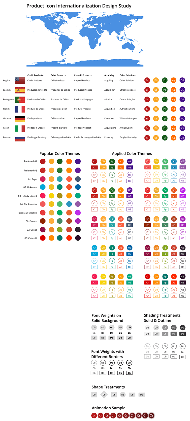 Landing on just the right icons involved exploring colors and iconography to develop specific systems and associations, along with specific colors and icons for different product categories. I also wanted to future-proof the system if it expanded beyond its current target of three languages, so I researched the most likely language expansions.