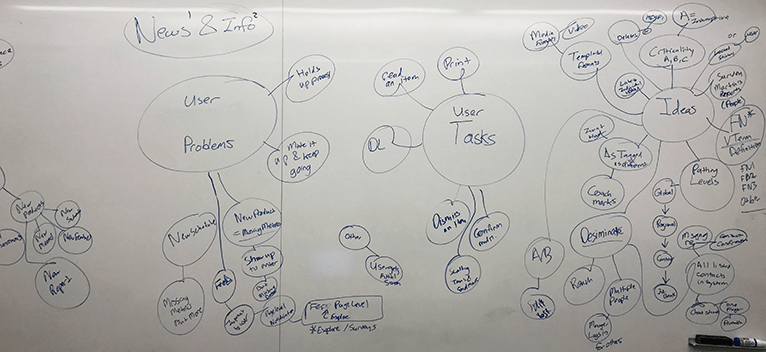 Large-format mind maps of high-priority features were printed and mounted on a wall. Key stakeholders and executives passed this wall daily, becoming an ideal way to expose them to the UX process, get buy-in, and build trust.