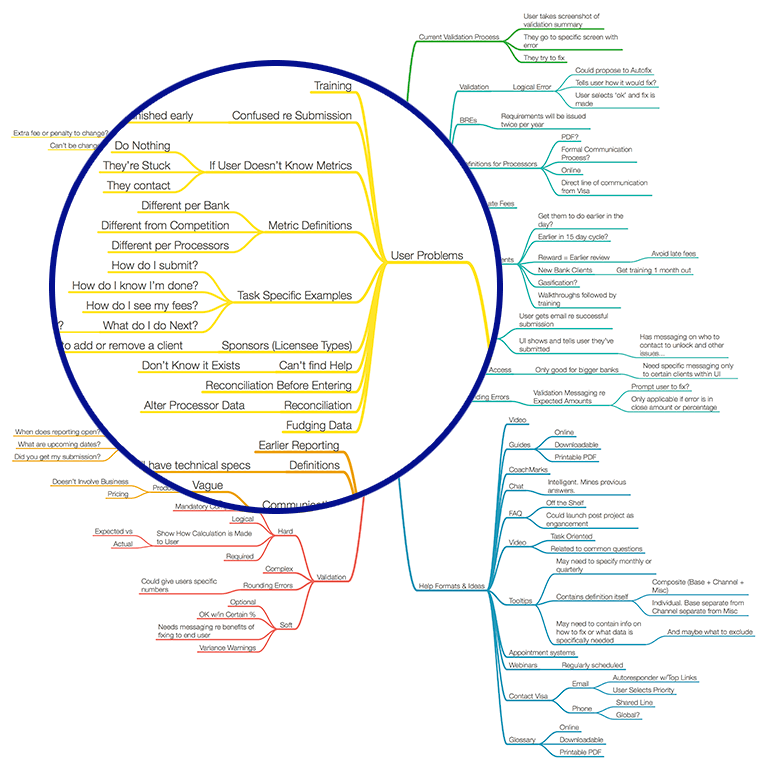Mind maps are among my favorite tools for representing complex data in an organized, visually-oriented and easy-to-understand way. They proved highly effective when I used them to represent the output from our previous ideation and design-thinking workshops.